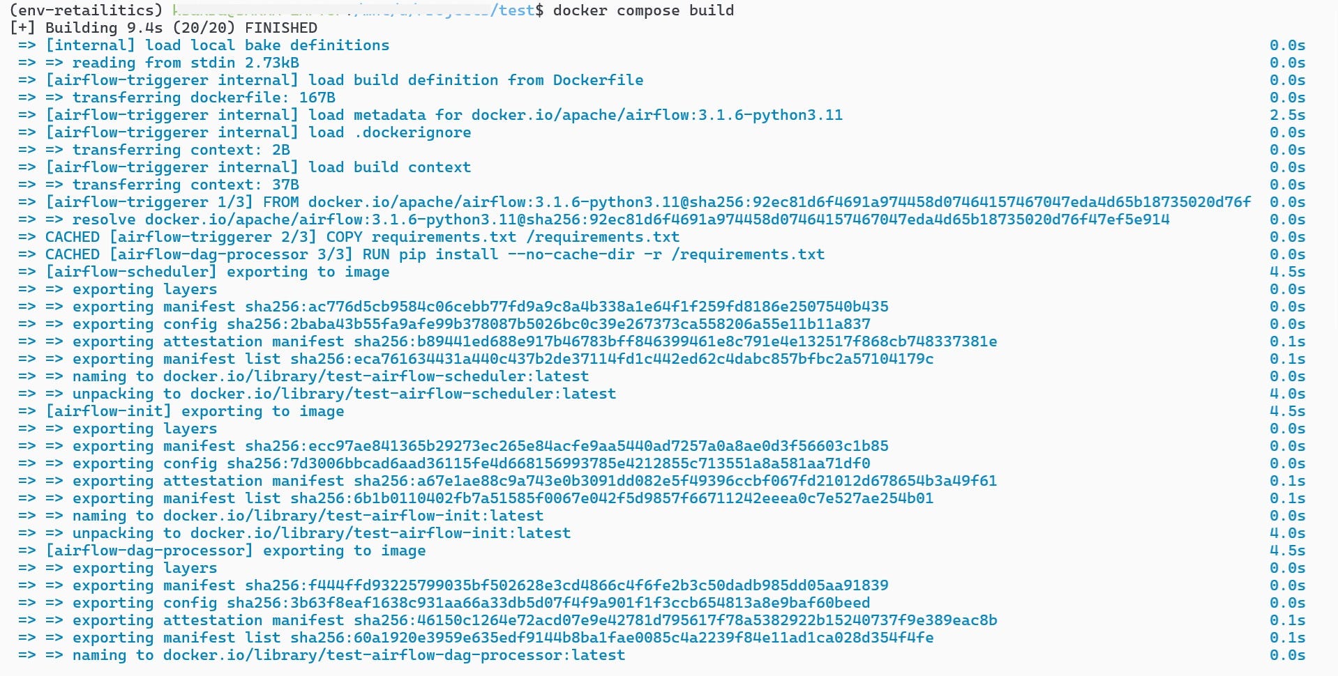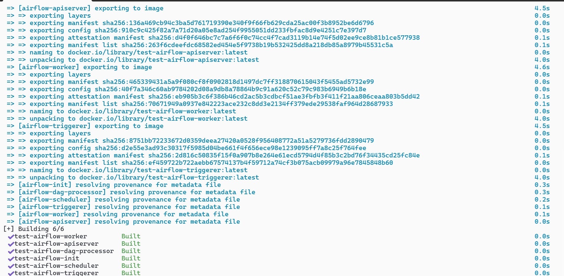 As you can see, it has built 6 images containing the Airflow components. You can then run the code as per the instructions from the Airflow site.