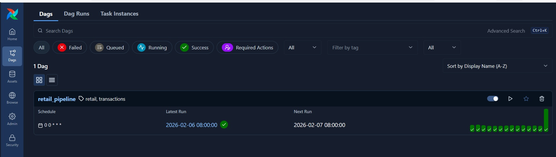 If you click on ‘retail_pipeline’, you can see the list of workflows and run history along with the DAG graph.