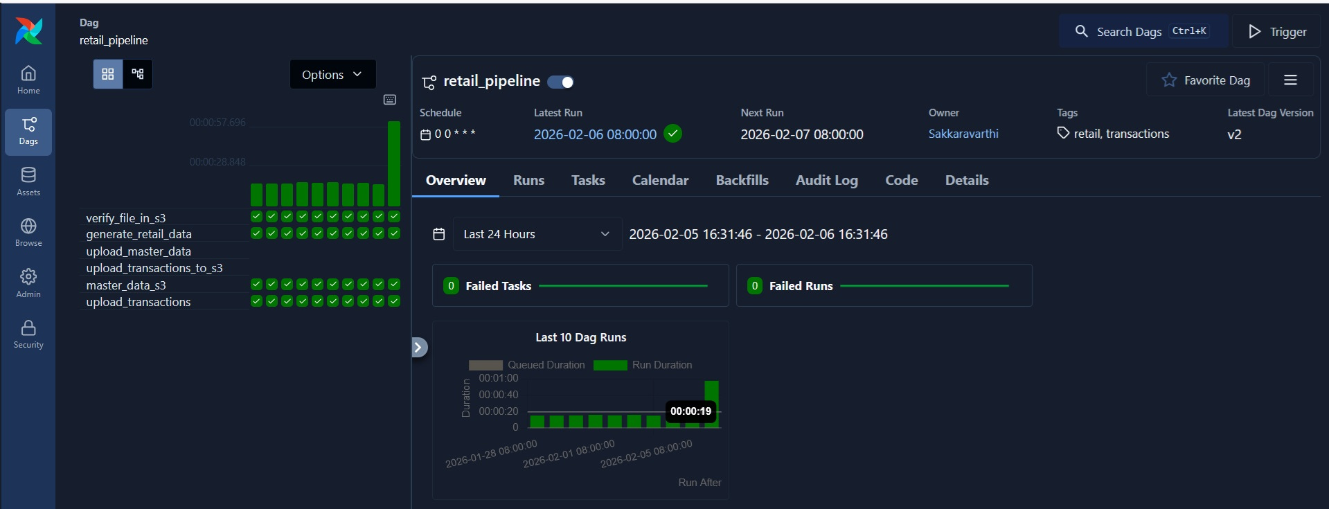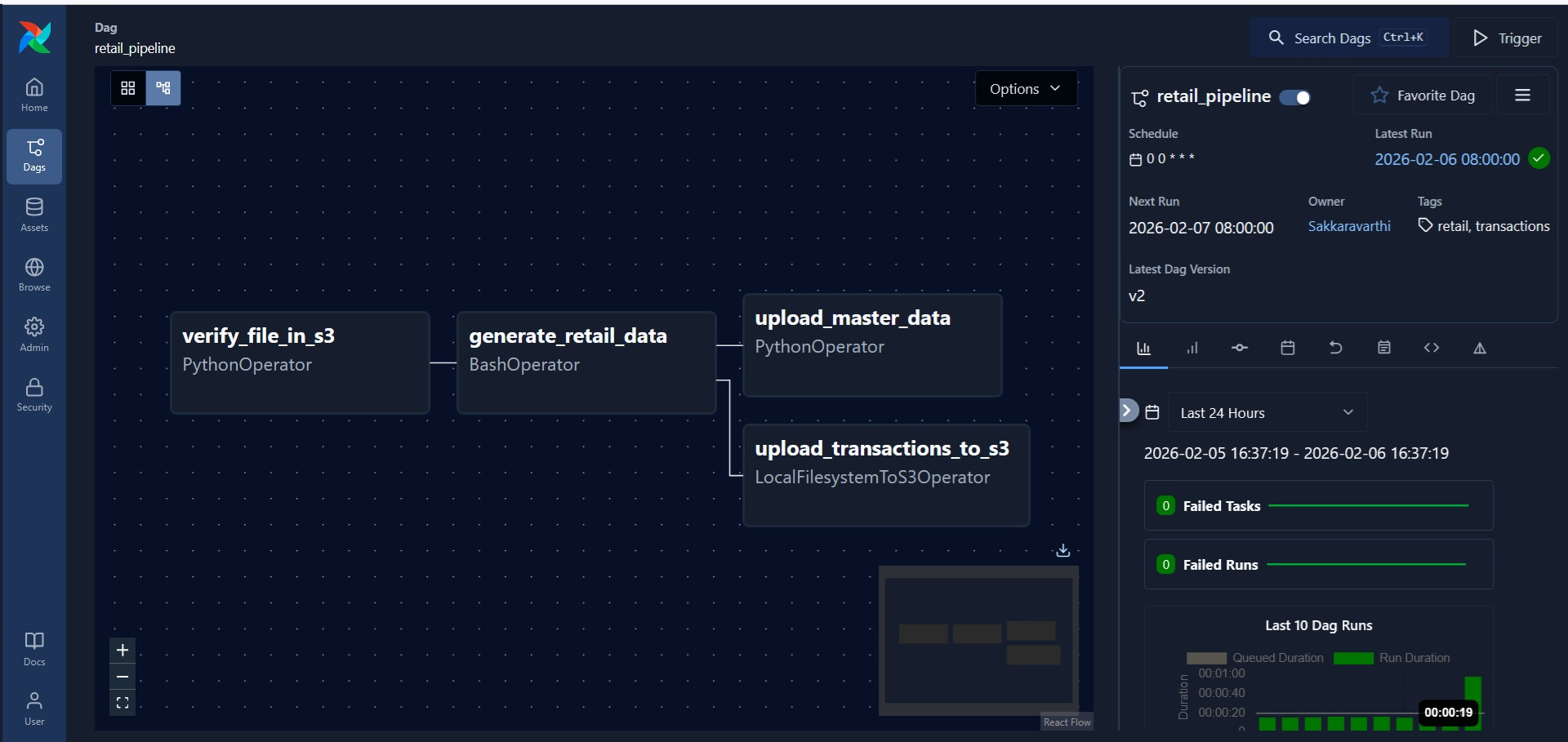 verify_file_in_s3 >> generate_retail_data >> [upload_master_data, upload_transactions_to_s3] This is the final line determines how the DAG will operate. You can see the DAG in the Airflow UI(‘localhost:8080’)