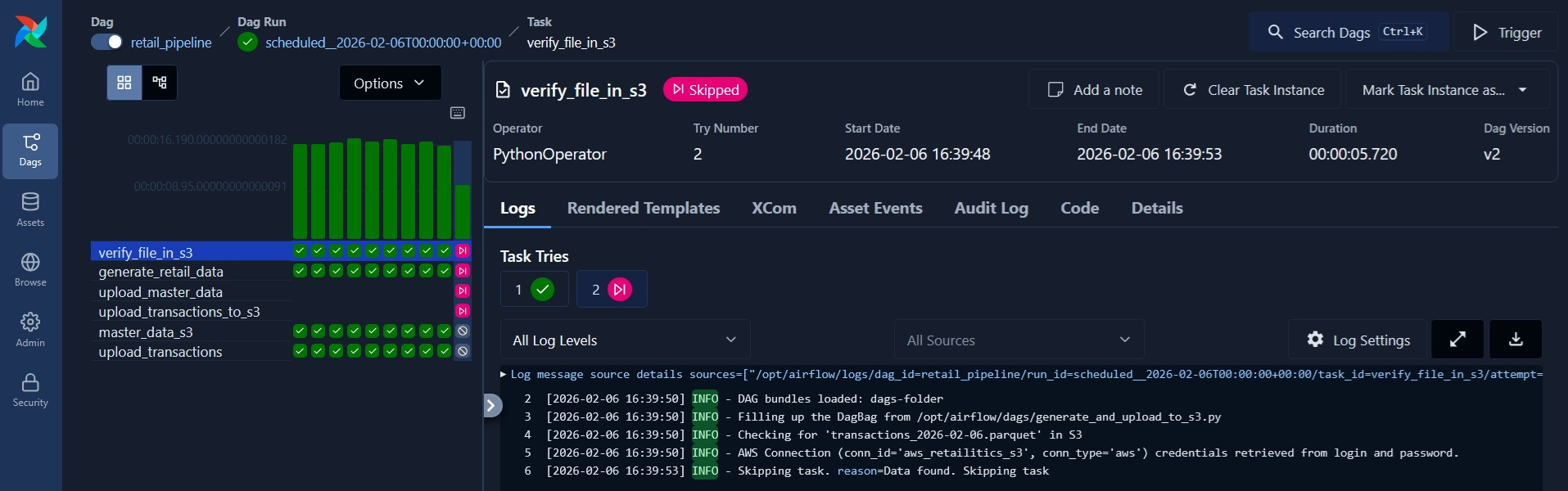 Since I have set DAG to run daily from 2026-01-01, it has successfully backfilled till date. I can ‘clear’ the run which will restart one of the runs, but will cause the run to skip because data already exists in S3.
