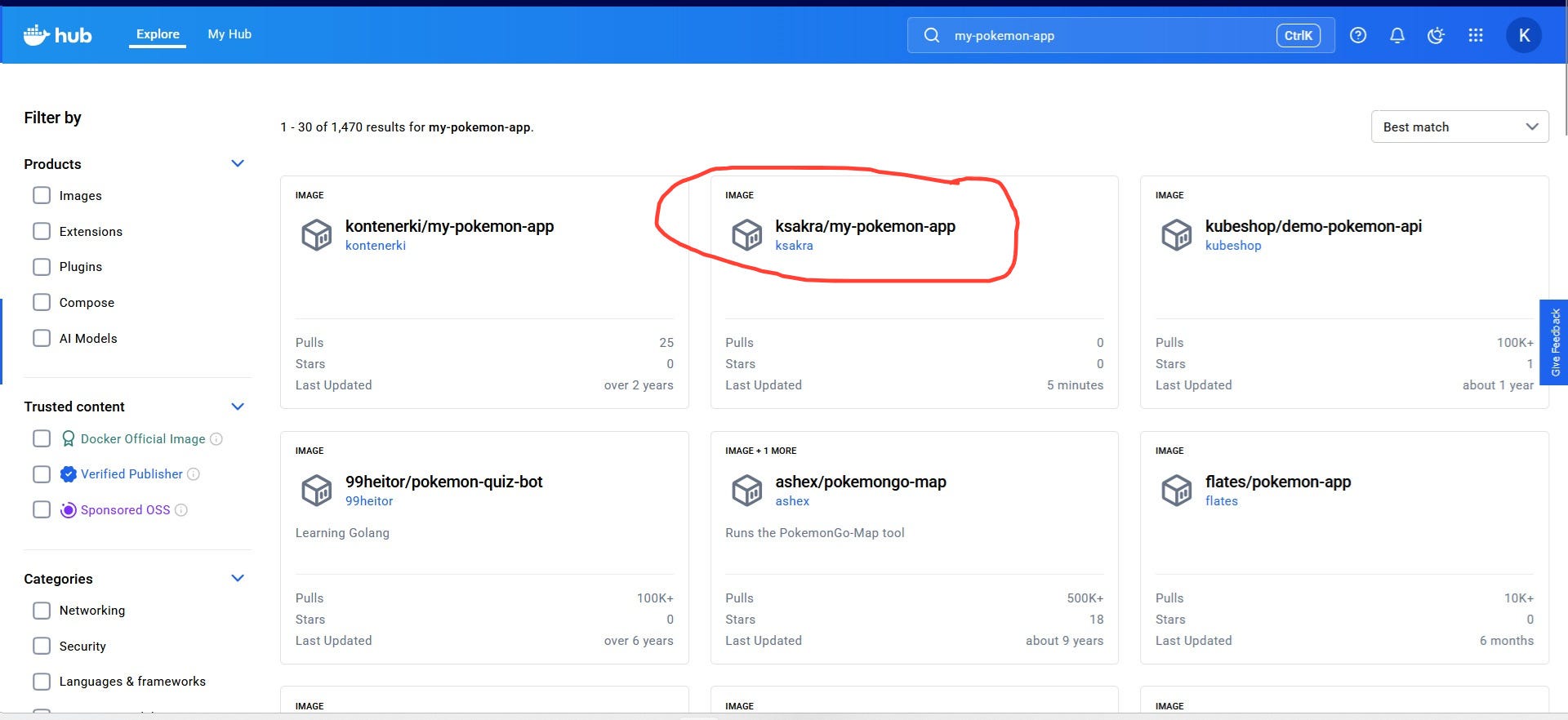 docker push ksakra/my-pokemon-appI have uploaded the image to Docker hub. If I want to download it, I just have to search for ‘my-pokemon-app’ in the hub and we get the below result.