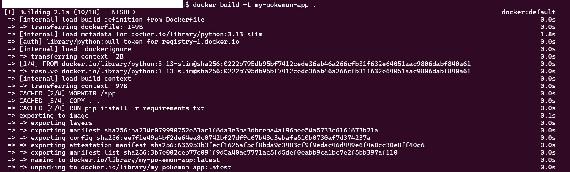 docker build -t my-pokemon-app .As you can see in the image, the image is ‘built’ here but python file is yet to be executed. Now that this image has been built, lets run the image to get our results.