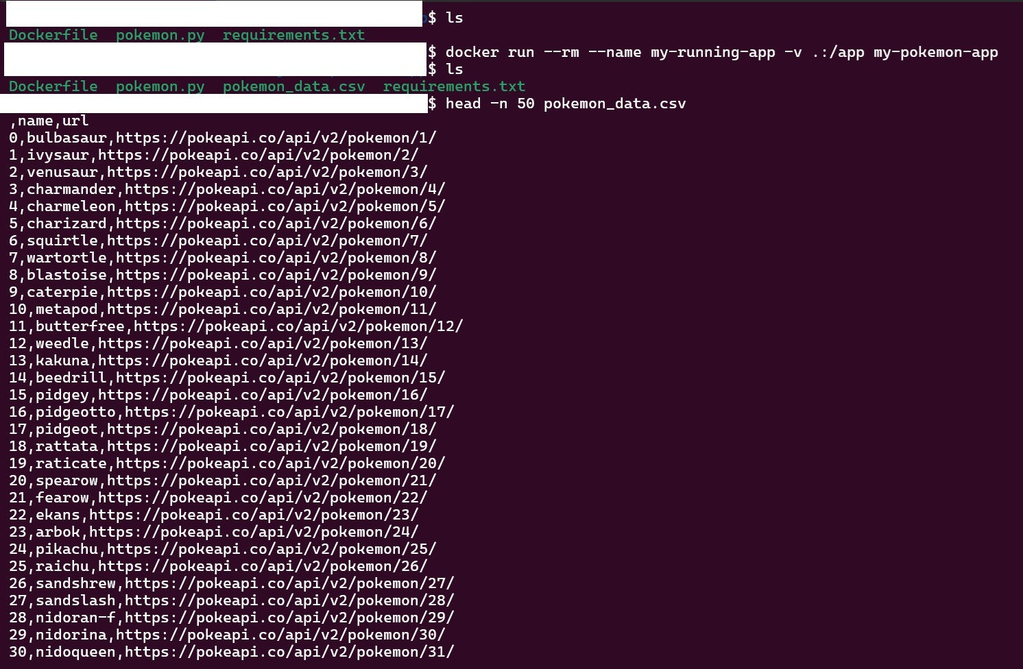 Here we can see that a new csv file is created with the pokemons and their respective urls. The best part of this is that I can share this image by uploading to Docker Hub.